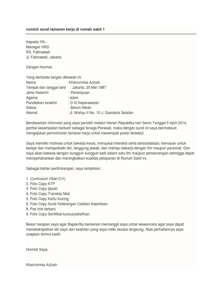 Contoh Surat Lamaran Kerja Di Rs from imgv2-1-f.scribdassets.com Tinggi badan 155 cm untuk wanita dan 160 cm. Jul 06, 2021 · mengajukan permohonan magang praktek keperawatan di rumah sakit woodward palu sebagai bekal pengalaman kerja, untuk itu saya mohon kepada bapak/ibu yang memimpin di rumah sakit woodward palu memberikan izin kepada kami untuk melaksanakan praktik tersebut. Demikian surat permohonan dari kami, terimakasih. Proses rekrutmen dan seleksi pada rumah sakit haji jakarta. Mar 17, 2017 · contoh kasus. Berdasarkan hasil job deskripsi dan job spesifikasi di hasilkan bahwa rumah sakit haji jakarta membutuhkan perawat dengan sfesifikasi sebagai berikut :